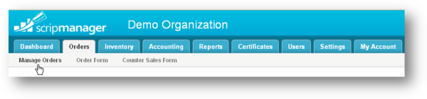 1. To unfill a certificate, you must open the order with the certificate in the order form. To do this, navigate to Orders->Manage Orders.