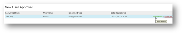 3. The New User Approval page will be displayed. To approve the new account, click the Approve User link in the new user row. To deny the registration click the delete user link in that row.